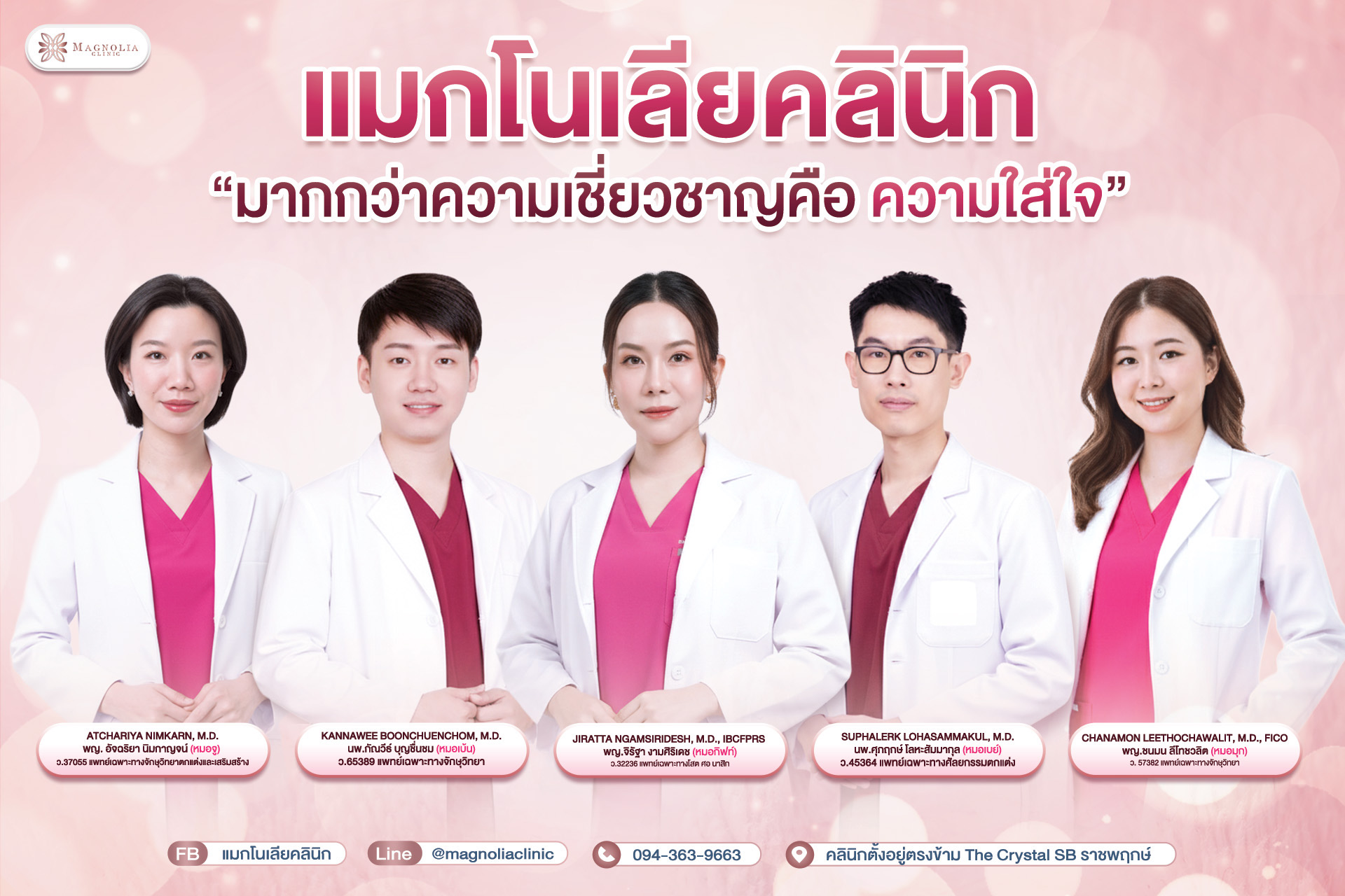 สำหรับ คลินิกความงามแมกโนเลีย (Magnolia Clinic) ถือคติว่า มากกว่าความเชี่ยวชาญคือความใส่ใจ เรามีแพทย์ผู้มีความรู้ในระดับนานาชาติ ที่มีความตั้งใจในการมอบบริการความงามที่มีคุณภาพเพื่อตอบสนองความต้องการลูกค้าทุกท่าน